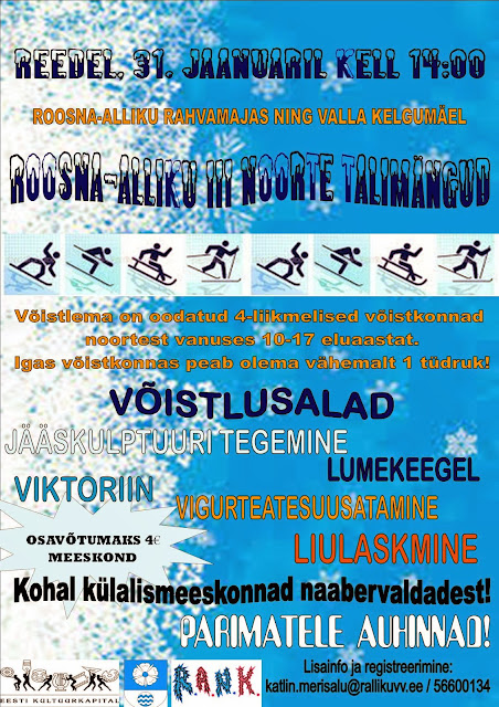 Roosna-Alliku III Noorte Talimängud toimuvad reedel, 31. jaanuaril algusega 14:00, Roosna-Alliku Rahvamaja kõrval